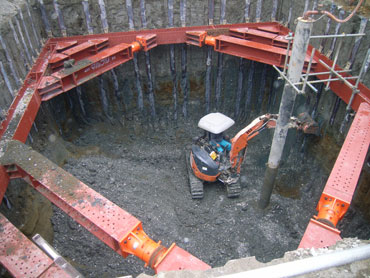 基礎の鉄筋の配筋工事をするための捨てコンクリートを打設している様子(写真手前に見えているものが杭の先端)